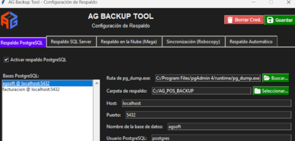Automatic backups for multiple PostgreSQL and SQL Server databases; secure cloud backup (MEGA and Google Drive); folder synchronization and scheduled task configuration. Compatible with Windows.